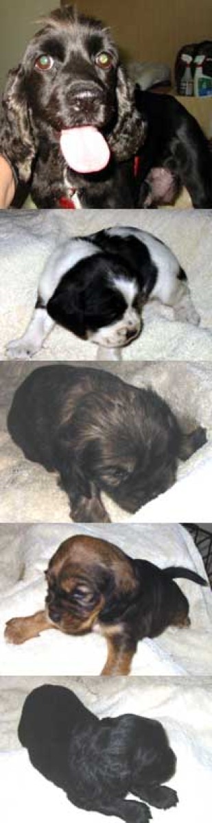 Molly, shown at top, is the mom of these four pups. She is a pure-bred Cocker. Dad was a Beagle. Her pups are, from Top to bottom: Speckle (Female), Bosco (Male), Ripples (Male), and Stormy (Female). These pups were born on June 27 and will be available for adoption when they are 8 weeks old.