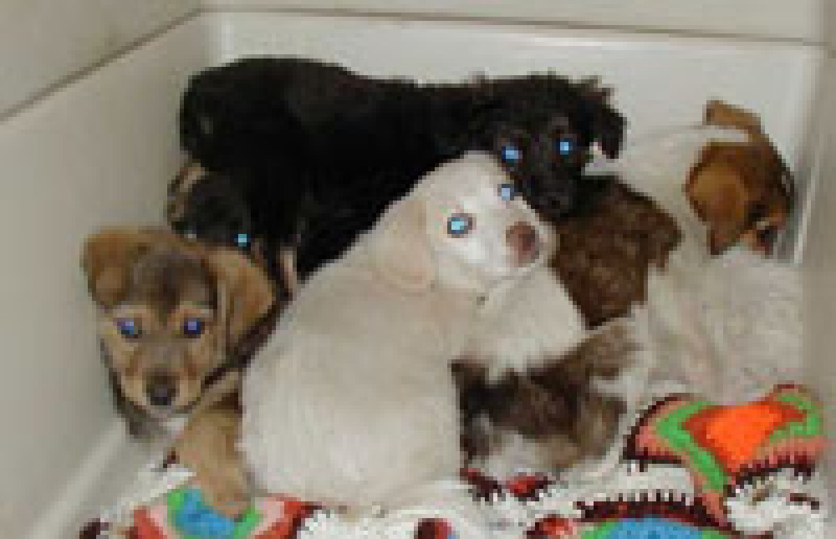 These poor little things were dropped off at the shelter. They were very dirty and scared. We don't know their breed, but we are guessing Lab/Shepherd at this time. As you can see, they are all different colors, hence the name.
