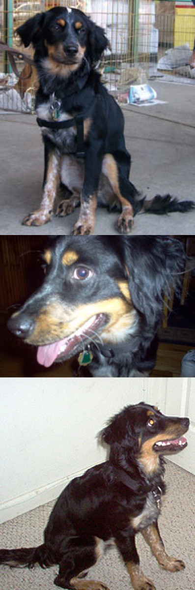 Baxter is a 7 mo. old spaniel/collie mix. Baxter is a happy, friendly dog. He is housetrained and loves to play. He enjoys wrestling and playing chase with the macho beagle in his foster home. He is learning to walk on a leash and has improved a lot. He barks when he's startled, but is getting quieter by the day -- just mellowing out in general and becoming a real sweet and friendly dog who knows how to be part of a family. He has nice markings, as you can see. Come meet him!