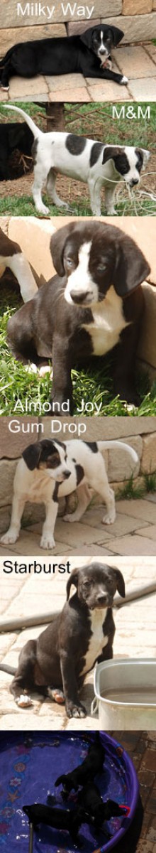 These adorable pups came to AFH recently from the Fayette County shelter. Their mom was a Beagle mix and weighed 25-30 pounds. M&M and Milky Way are boys and the rest are girls. M&M is still available.