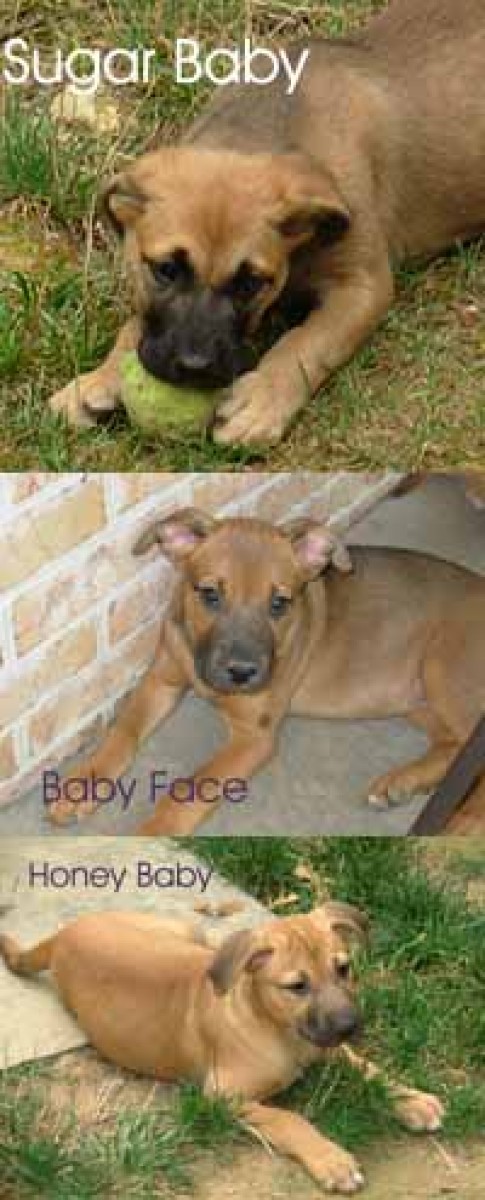 These three adorable sisters were rescued from a shelter in Georgia. The Sweet Babies are just that--Super sweet and very playful! Sugar Baby looks more Shepherd than her sisters. She is very playful and gets along very well with all other dogs. Sugar Baby won't pass up a chance to play or cuddle. Honey Baby is as sweet as honey. Her instinct is to stay close and give lots of love. She will make an excellent best friend to her new family. Baby Face has the unique combination of a Shepherd/Lab mix with the most dear expressions. She may be the smallest of the sisters, but she is mighty. Baby Face enjoys playing with the other dogs, but would probably enjoy being princess of her own house too. Baby Face is still available.