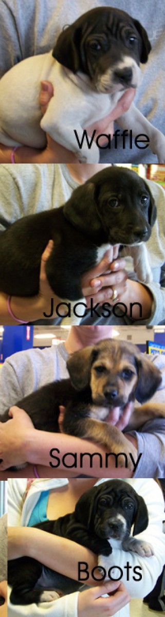 These adorable pups came from a litter of seven. The cuties pictured here are still available for adoption. They originally came to us from the Fayette County shelter. We were told they are Beagle mixes, but do not what other breeds are present. They are the sweetest things ever!
