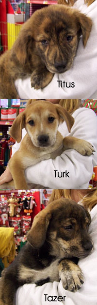 Titus and Turk are still available. These pups are Tamra (female), Tazor (male), Tish (female), Trevor (male), Tora (female), Titus (male) and Turk (male). We believe they are boxer/retriever mix pups. They were left in a trailer by an abandoned mine with a container of food. By the time their cries were heard by a passerby looking for a lost dog, the food had been long gone. We believe the pups were about 6 weeks old when they were found and taken to the Fayette County shelter. They are now safe in AFH's care. Applications are being accepted now.