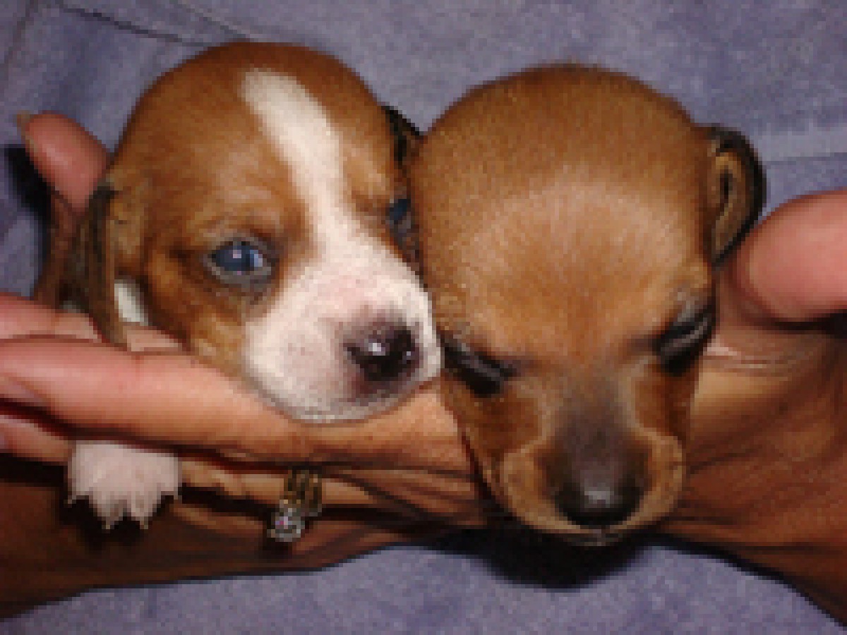 Frannie and Fritz are Clara's pups and were rescued from a West Virginia puppy mill along with their mother. They are about 2-3 weeks old in this picture. Once they are 8 weeks old they will be available for adoption. (Both pups are adopted and are just waiting to be old enough to go home.)
