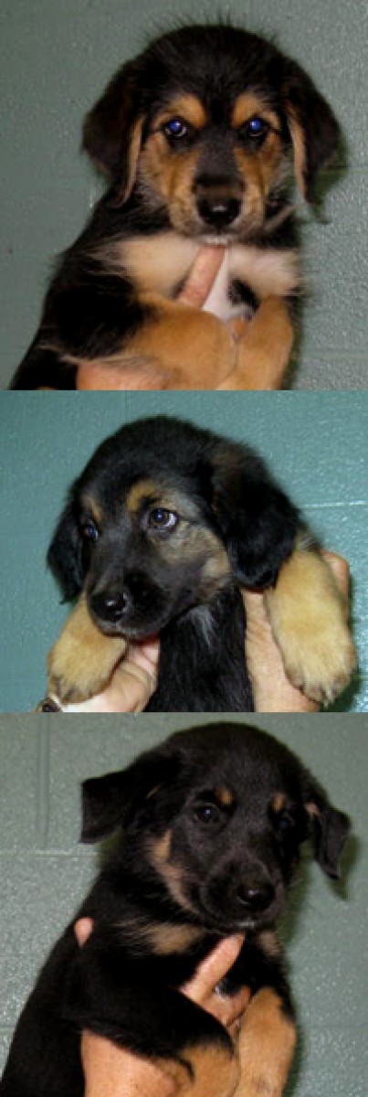 These three adorable pups came to us from the Parkersburg Humane Society. The dog shown at top is Fonzie, middle is Fuzzy, bottom is Franny (girl). They are cuddly and cute. Fonz especially has lots of longer terrier hair rising above his shepherd hair. They are healthy and playful and they look like they will stay medium sized dogs as adults.