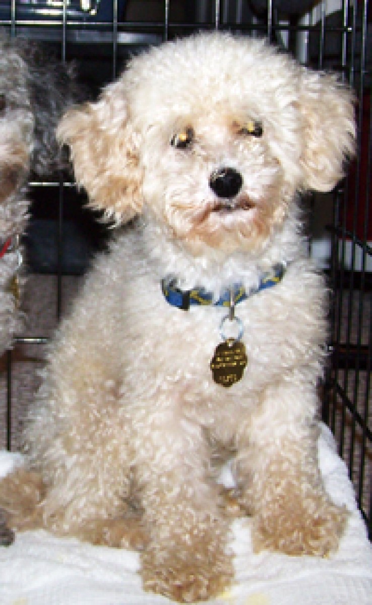 I'm Waffle (cream) and I'm 6 years old. I'm a little smaller and shyer, and more afraid of the stairs, but I'm making progress. I like to run around in circles, dance, play paddy cake, and I love to be cuddled. Outside, I prefer to stay close to my foster mom and climb in her lap when she bends down. I'm not quite as good at the housebreaking stuff, but I'm getting better. We both do pretty well at walking on a leash, but still get scared at all the new sights and sounds, especially other dogs (even though there's a dog in our foster home), but we're starting to warm up to people. We guess that's normal, since we were stuck in a crate all the time at that puppy mill place. We just need someone with a lot of love and patience to give us a forever home! By the way, Taylor and Tyler, we think we’re the cutest and smartest dogs from the puppy mill!