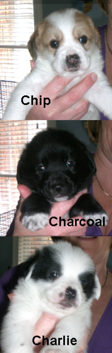This chubby fluffy trio are just lovely. They are all males. Charcoal is a black colour but the ends of his fur is tinged with a deep brown. He is fuzzy just like a big teddy bear. He has white toes and chest. He pesters his mom non-stop for food and is super fast on his feet. Chip is the sleepy dopey one of the bunch. He is happy to lift up his head and watch what his brothers are doing, then head down and relax a bit more. He is white and has brown patches and looks very like his mom. Charlie is white with black patches. He is the smallest of the trio - but don't let size fool you. He is just as interested as Charcoal in the world outside the crate and is also very quick to abandon ship and get out for a run around. The pups will be ready for viewing as soon as they are 6 weeks old at my home. Applications are seriously suggested ASAP as they will be dealt with in strict order of receipt and I know from past experiences these gorgeous boys will be in high demand and probably be snapped up before they make an adoption event. E mail me for any other information...Charlie is still available for adoption.