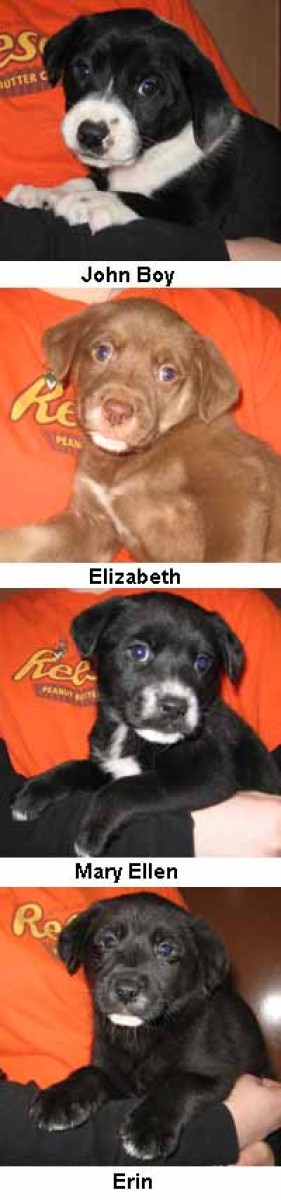 Cocoa's pups were born on 1/16/2010. There were five pups, but one was given away by their family before taking them to the shelter. They were raised around kids and do very well with them. Each of these pups weigh about 10 pounds. Mary Ellen and Elizabeth have been adopted.