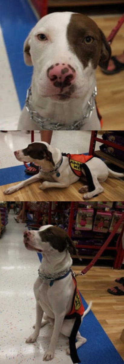 Hi, I'm Justice. You can see from my picture that I'm one good looking, young, stud. My foster mom said that I'm "fixed". I'm not sure what that means but regardless, I'm still "the man"! I'm only about a year old and I weigh about 75 lbs. You can see that I try to keep in good shape and am nice and slim. The girls love that! Everyone says that I'm really handsome and very unique looking. I'm all white, except for a big brown spot on my back, some on my ears and a big patch over my left eye. My foster mom says she loves my pink nose and big paws. What can I say? When you got it, you got it! Anyway, I'm also a bit goofy and I have A LOT of energy. I have been known to fly. Well actually it is like a big leap in the air and I'm able to run really fast and then jump on the furniture. It kind of looks like I'm flying. Because I have not spent much time in a home, I need some help on my manners. We are working on that now and the dogs that I live with now are helping me to learn. But I'm totally potty and crate trained and I walk well on a leash. So, basically I'm perfect except that you'll have to be firm with me for a few months until I really catch on to how to live in a home instead of the shelter. Please send us an email, if you would like to meet me. It will be worth your while.