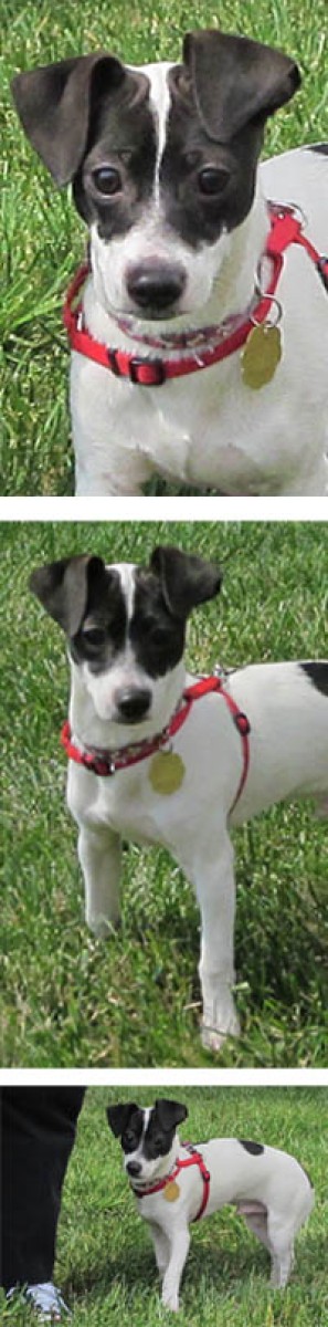 Return: These are Bella's babies. There are 4 boys (all black/white) - Baby Emmett, Baby Jasper, Baby Edward and Baby Jacob. There is one little girl (choc/white)named Baby Rosalie. Rosalie is the biggest and certainly rules the roost. Emmett is the most outgoing and gives Rosalie a run for the money. Jasper is the shy quiet one, Edward and Jacob are playful bouncey pups. Mom weighs about 15lbs and we expect the pups to weigh between 15-20lbs when full grown. Baby Jasper is still available for adoption