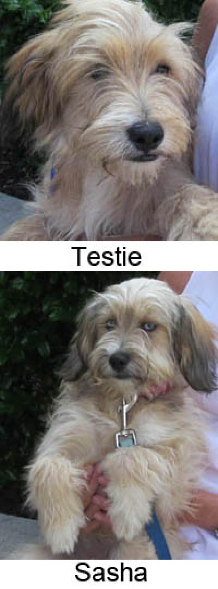 Sasha and Testie arrived at our home on Sunday, May 22nd. After a bath that they both actually seemed to enjoy, they are now the cutest, softest, little fluff balls you have ever seen. Testie could be the stunt double for Benji from the movies and Sasha has mesmerizing eyes...one blue and one blue/brown. They stay in an indoor pen and keep it very clean and dry. They already walk well on a leash in our yard and have learned quickly that that is where they are "to do their business"...pretty amazing for 13 week old puppies. They are very playful with each other and with all the neighbors of all ages that come to play with them. Please e-mail A Forever Home if you are interested in meeting them at our Sterling home. Sasha has already been adopted.