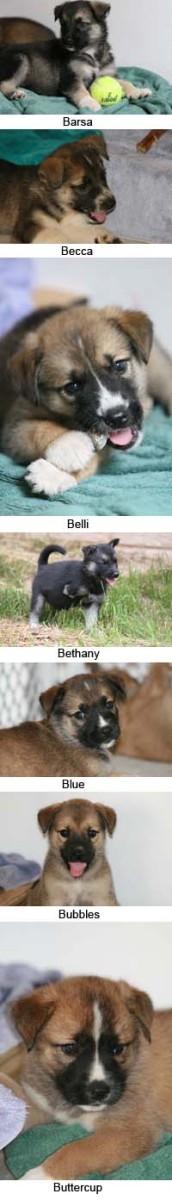 These poor babies were confiscated from a home where they, along with their mother, were being neglected. It appears mom and her the pups were attacked by an animal as they had puncture wounds. Update: Bubbles is such a happy sweet little girl. She has a very even temperament and loves to bounce into new opportunities. Buttercup is the largest female and, like Belli, can be found snoozing near the food bowls. When not napping or chowing down, Buttercup is ready for a wrestling match, tug of war, or belly rubs and loving. Bethany was named after Bethany Hamilton from "Soul Surfer." Like Ms. Hamilton, Bethany lost a limb when another critter tried to have her for breakfast. Bethany hasn't let her missing leg slow her down. She is a determined little girl with a sweet disposition. Blue started out a little timid and shy but boy, has she figured out that a human snuggle is a wonderful thing. If you need your face cleaned she will be happy to oblige! Barsa (short for Barcelona) is the alpha male. Barsa loves to play and explore and likes to wake his siblings up for a little wrestling match. Becca is the alpha female. She leads the pack out the door and is always game for some playtime. Belli is a big boy and a laid back kind of guy who likes to snuggle. His favorite place to snooze is close to the food bowl - he is no dummy. Go to https://picasaweb.google.com/stacy.smithtucker/20110612FosterPuppies02?authkey=Gv1sRgCNSVw7n0hderSg&feat=email to see more pictures.