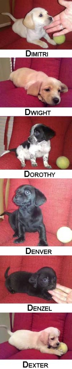 Denver, Denzel, Dexter, Dimitri, Dwight and Dorothy are such cute pups. We are told they are Chi mixes...Hi Everyone - I am Dimitri, the most handsome of the Delightful pups (I am the one in the bottom picture trying to hold the tennis ball). We went to the adoption event on Sunday and everyone loved us, they picked us up, passed us around and told us how adorable we were. It was so busy and so crazy and we met lots of people. We were so happy because we thought we all got our forever homes. But, it turns out that I didn't get a home. I know that must be a mistake because I am the smartest, most handsome of the bunch (I don't want to brag, but it's true.) So, if you wanted to adopt me but forgot to or thought that some else got me, please come contact us. I am happy for my siblings, but I want a home, too.