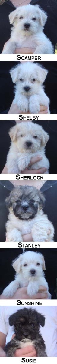 Here they are Shelby, Sunshine, and Susie; and their brothers Stanley, Sherlock, and Scamper. These pups are Maltese Schnauzer crosses making them Mauzers! There are six pups (3 boys and 3 girls) and are currently 2 lbs each at 5 weeks. The people that owned them had posted their pictures on a bulletin board with the note "Free to good home". Luckily a rescue person was able to intervene and we have agreed to take the pups into our rescue. This way we can ensure they get good homes and are protected by a contract so they will not be in any danger of ending up at a shelter. Sherlock and Scammper are still available.