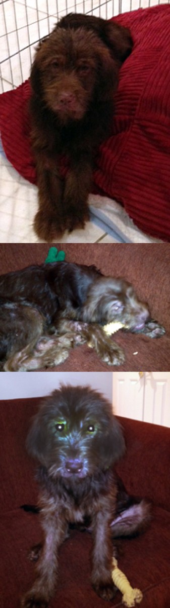 What a trooper this girl is. Chloe is chocolate brown and about 24 lbs of affection. She came from a hoarding situation and this is her first experience in a true home and she's doing great! She's sort of low key and mellow, likes to cuddle up next to you on the sofa or chill in her dog bed with a stuffed toy. Now that she is feeling better we are working on crate and housebreaking. She seems to be picking up that quickly. All in all, she's going to be a very pretty girl with a super sweet disposition wit a bit more time and care.