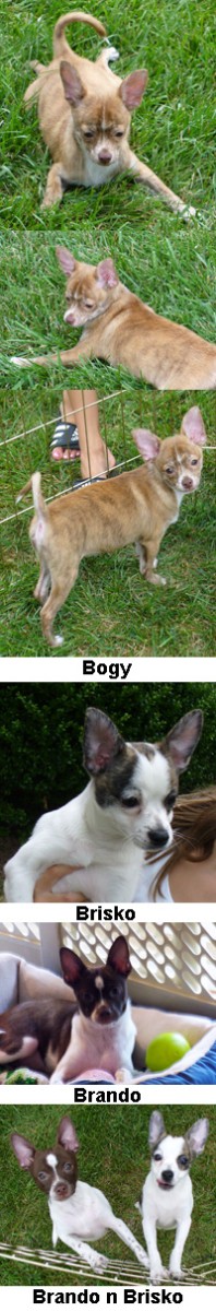 The puppies are doing very well. They are working on potty training and are pretty close to being paper trained. They love to run in the yard and hop through the grass. They have the funniest personalities and play with each other with their chew and tug toys, but much prefer to chase toys that are thrown by their human caregivers. Brando gets all the toys from the pen, gathers them in his bed and sits on top of them as if hiding them from the others. Bogy marches right in and steals them away to another corner for safe keeping. Brisko does the sneak attack and steals them right back to another area of the pen. The action continues until everyone is pooped out and settles with whatever toy they have to fall asleep on top of. They are happiest being held and sitting in your lap. They adore being around other dogs and children. These adorable Chihuahua mix pups will bring a smile to anyone's face and will definitely warm your heart. If you would like to meet them, please come to our adoption event.