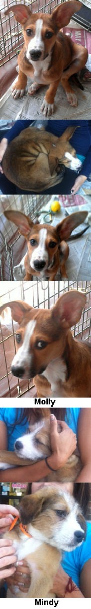 Molly and Mindy are sisters. Molly is a truly lovable, goof of a dog. She is very gentle and kind with our son, and gets along well with other dogs. Molly has not grown into her limbs yet, so it is quite adorable to see her flop around and run. She can be a little shy at first, but within minutes will show her silly personality. If you are sitting on the ground, she will come up and cuddle or put her butt on you (after she gets out her pup energy, of course). Help us find a forever home for this sweetheart! Check out her ears, some have nicknamed her the Flying Nun. Mindy is tiny, but don't let her size fool you. She is a spunky little sprite with opinions and a high intelligence-level. Mindy not only will train easily, she may start bossing you around! 😉 She is also sweet, fun-loving, and great with kids and other dogs. Mindy also likes being held like a baby and will fall asleep in your arms.