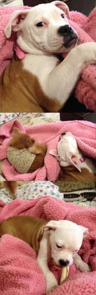 I am fostering Fiona for A Forever Home. She is a sweet little pup and a typical 3 month old; not housebroken as yet, into everything in a curious way, plays hard and then sleeps hard. She listens when you correct her and generally stops trying to unroll the entire roll of toilet paper which is her new favortie activity. She gets along with the small dog in my home although she does play a bit rough as she's much larger than the other dog. All in all, she's a fun, funny, cute chunk of a dog. She's also prettier than a lot of bulldogs as she doesn't have as much of the "smushed" face or underbite. Like most bulldogs she does snore a bit although not too bad. If you have other pets you should introduce them before deciding to adopt her and regarding children; I wouldn't recommend that she be adopted to a family with very small children as she is a solid little girl and without any intent, could easily knock a small child over. And finally, because she is considered to be a bully breed we will not adopt her to someone who rents. Too many landlords are now refusing to allow any of the bully breeds, regardless of the temperament of the individual dog.