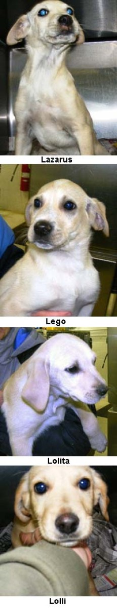 This Dog has already been adopted! Keep looking for your perfect match on our available Dogs page. Lolita/Yellow Lovies (Altered) — Date of Birth: 09/30/2012 (13 years old (Senior)) Yellow Labrador Retriever Mix Lolita, Lego, Lazarus and Lolli have just arrived. Lazarus, Lego and Lolli have been adopted. Available Dogs