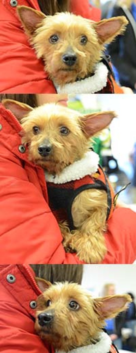 Ollie came to us from a puppy mill in Alabama as part of the Yorkie Claus Rescue Effort. He is still gaining his confidence, but he is improving every day. He ventures out of his pen when the door is open, explores the kitchen for a few minutes and runs back as soon as we go near him, but he voluntarily sits on my foot whenever I am working at my desk 🙂 He loves our dog, Callie, follows her everywhere and wags furiously at the sight or sound of her.