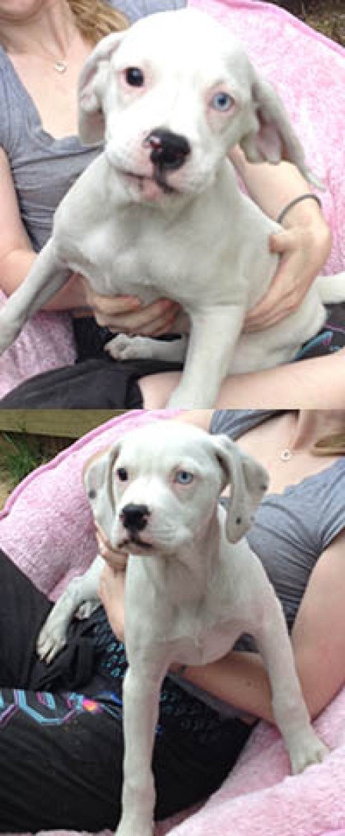 Isis is a smart little girl.  She is adventurous and playful.  Isis is good with everyone.  She is fine playing with her siblings or by herself.  Isis will be about 40lbs when full grown.  Due to her being mostly white with light eyes there is a possibility that she is deaf.
