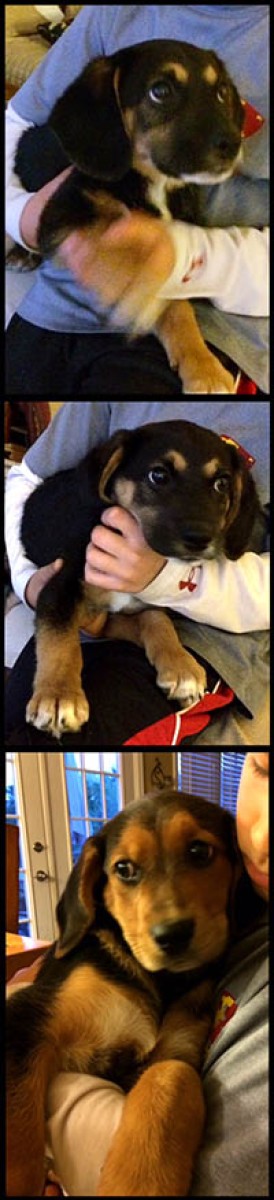 Hugo is a Shepherd/Hound mix. We believe he will be around 50 pounds full-grown. He is nearly housetrained with only the occasional accident. Hugo is crate trained and sleeps all night in his crate with no problem. Hugo is very inquisitive and very playful. He also enjoys belly rubs. He has learned to sit on command and not jump up and is working on stay and shake. He is just the sweetest pup and would love to find his forever home soon.