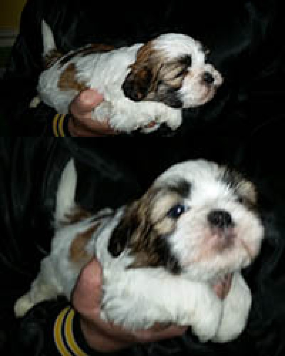 Guiness is the only male in the litter and certainly looks like he is the boss. He is bigger and fluffier than his sisters. As his foster, I nicknamed him the mop. Even as a very small puppy he laid right out and his width and length make him look like a spotted little mop. He is extremely fluffy with very very soft hair he loves to rough house with his siblings . He is very curious.