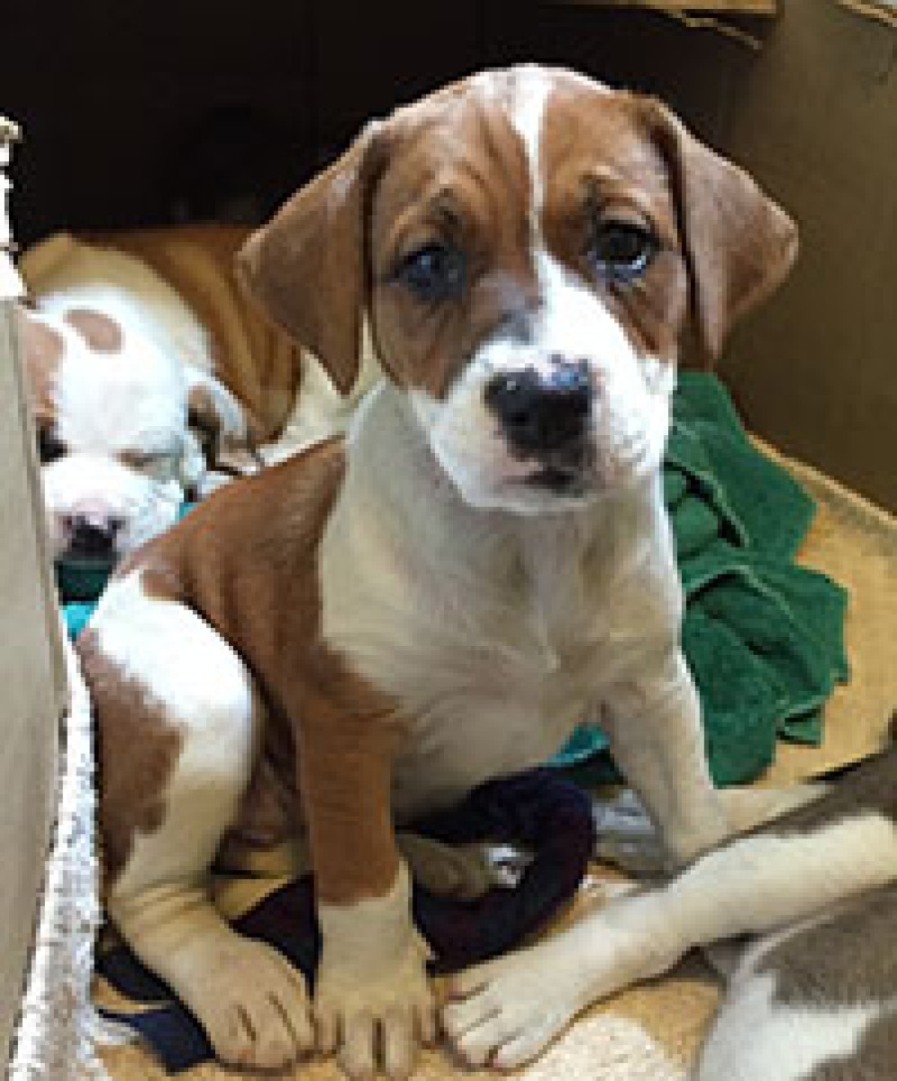 This litter arrived on Saturday from a shelter in West Virginia. Bandit is one of the two girls of the litter. Even though she is slightly smaller than her brothers, she keeps up just fine. She is very spunky and curious about her surroundings. She loves attention from both adults and children and is very photogenic. She has been doing very well at paper training as well. She is adjusting well to people considering she living in a shelter for weeks. She has already had her first shots so she will be ready to go home the on 8/23.