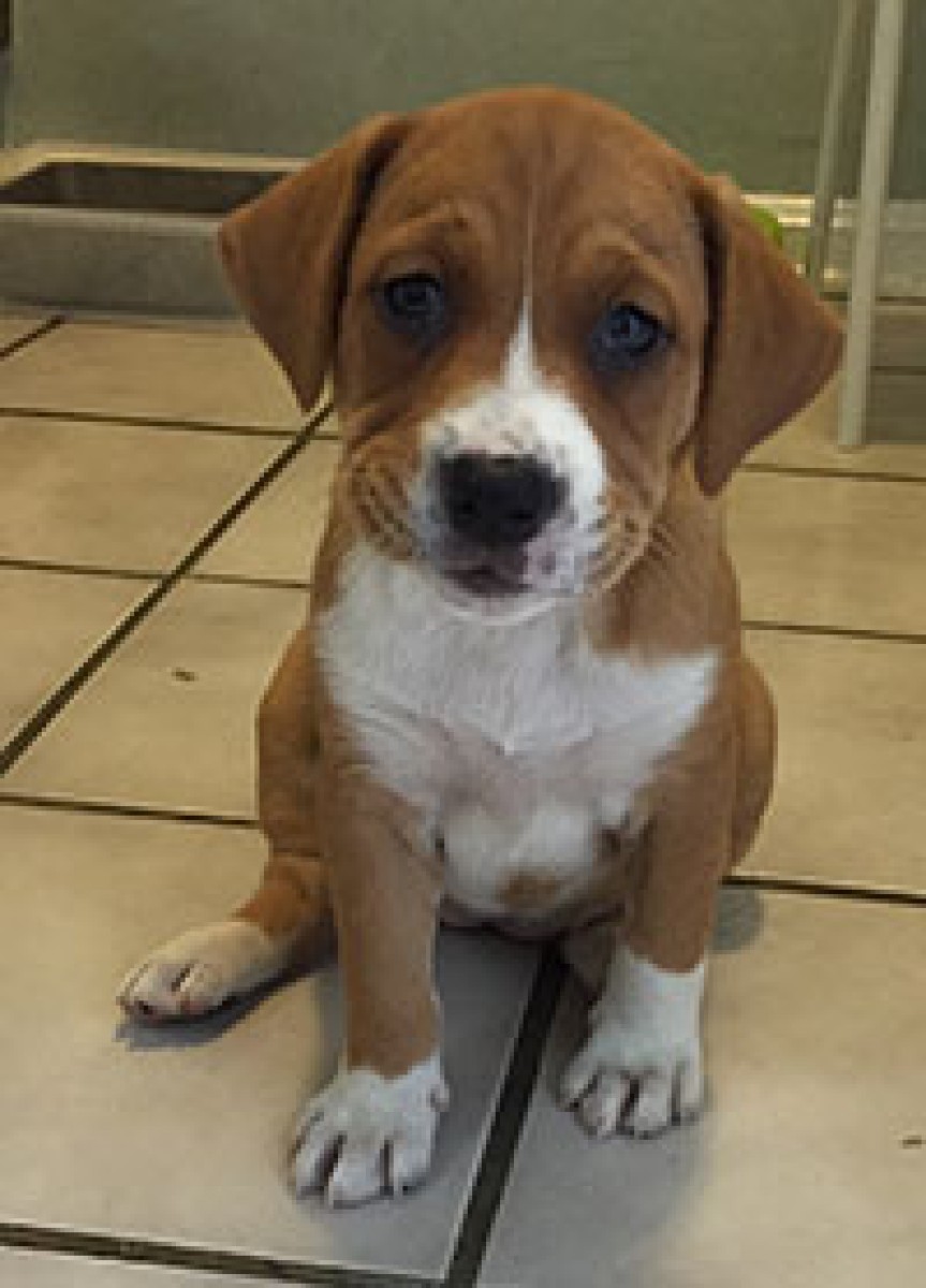 This litter arrived on Saturday from a shelter in West Virginia. Beauty, as the name suggests, is a gorgeous puppy. She is the other girl of the litter and is slightly smaller than her brothers. Beauty is a sweetheart, when tired, she will fall asleep in your lap. When she wants to play, she will hop around trying to pick up toys with her paws. She is adjusting well to people considering she was living in a shelter for weeks. She has already had her first shots so she will be ready to go home the on 8/23.