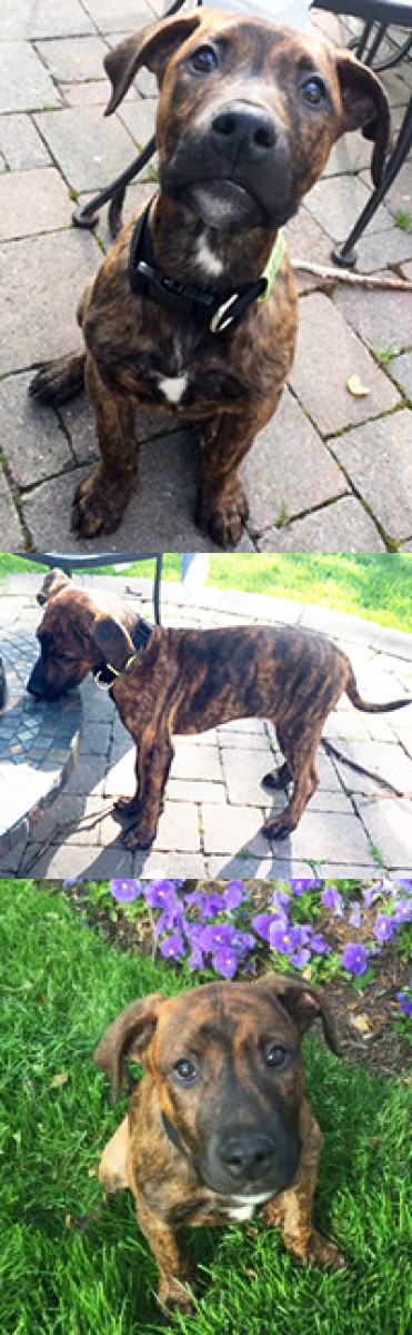 Frankie is a friendly boy. He should be about 55 pounds full growns. He has a beautiful brindle coloring and is wonderful with kids and other dogs. He is doing very well with being crate trained and house trained. Frank just loves to romp in the yard, play with toys and cuddle.