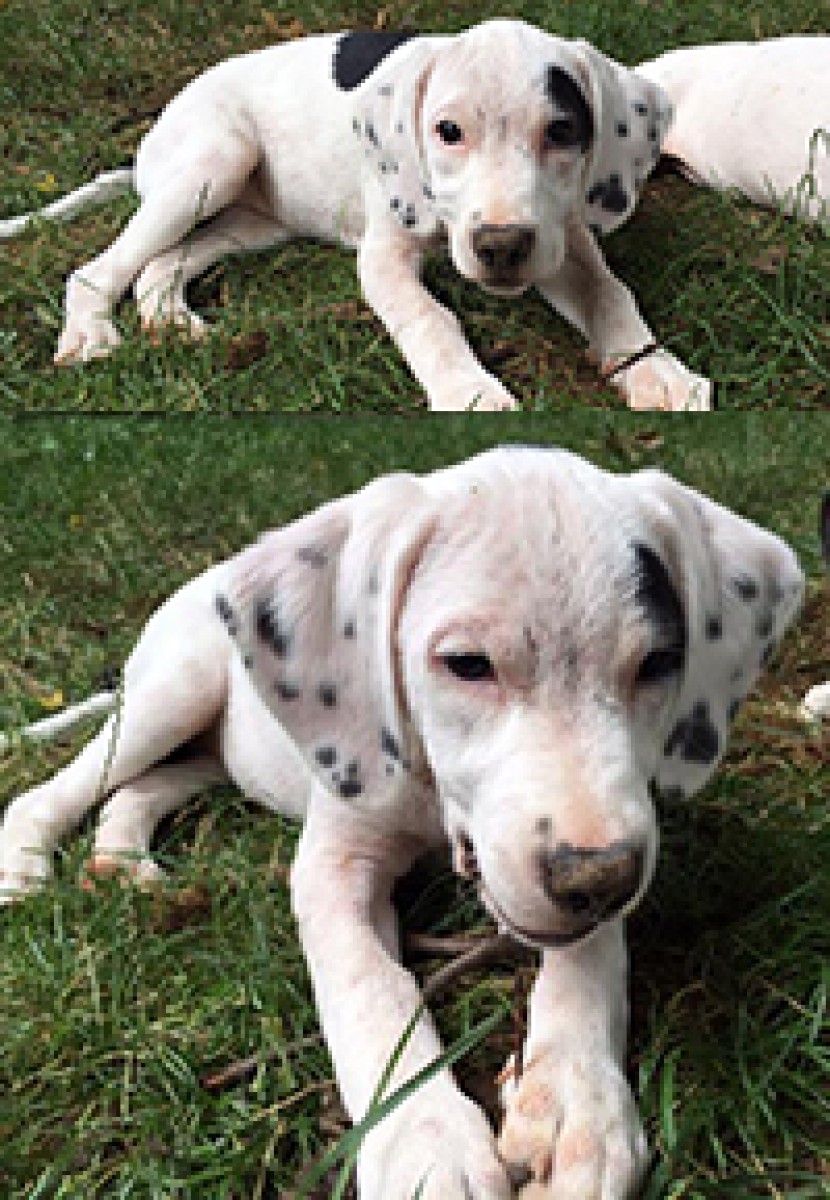 This is Audrey. She is a big puppy who loves to run around rough housing with her brothers and playing with toys. She is full of energy and also very affectionate. She has the softest coat, like silk and her huge ears are spotted like a dalmatian's. When she is tired she will curl up in your lap and go to sleep. .