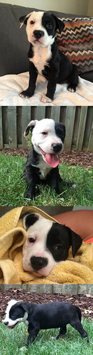 This is Parker. He is almost a twin to his sister, Patti, but a bit larger. He is one of the leaders of the pack and does extremely well with my 6 year old female pit. Like his siblings, he loves to play tug o' war and is an active little guy. He did great in the bath too and wasn't afraid of the water.