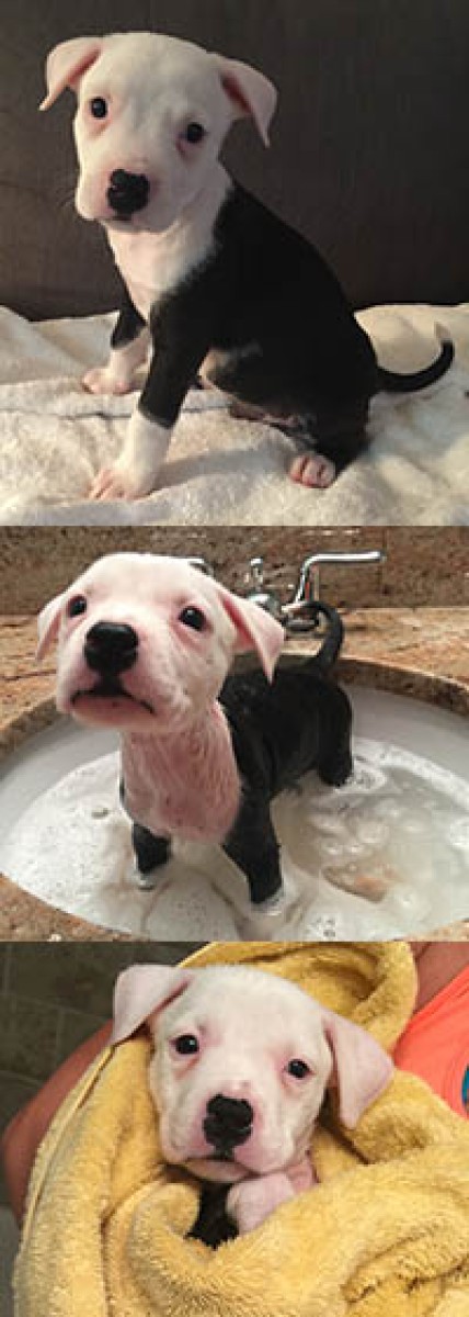 This is Paco. He is the runt of the litter but he sure doesn't know it! He is FULL of energy and has all the confidence in the world. He is very playful wit my 6 year old pit bull and loves playing with his brothers and sister. He loves exploring in the backyard and hops through the grass like a bunny. He also looks pretty unique within the litter because he has a full white head and it looks like he is wearing a onesie! 🙂