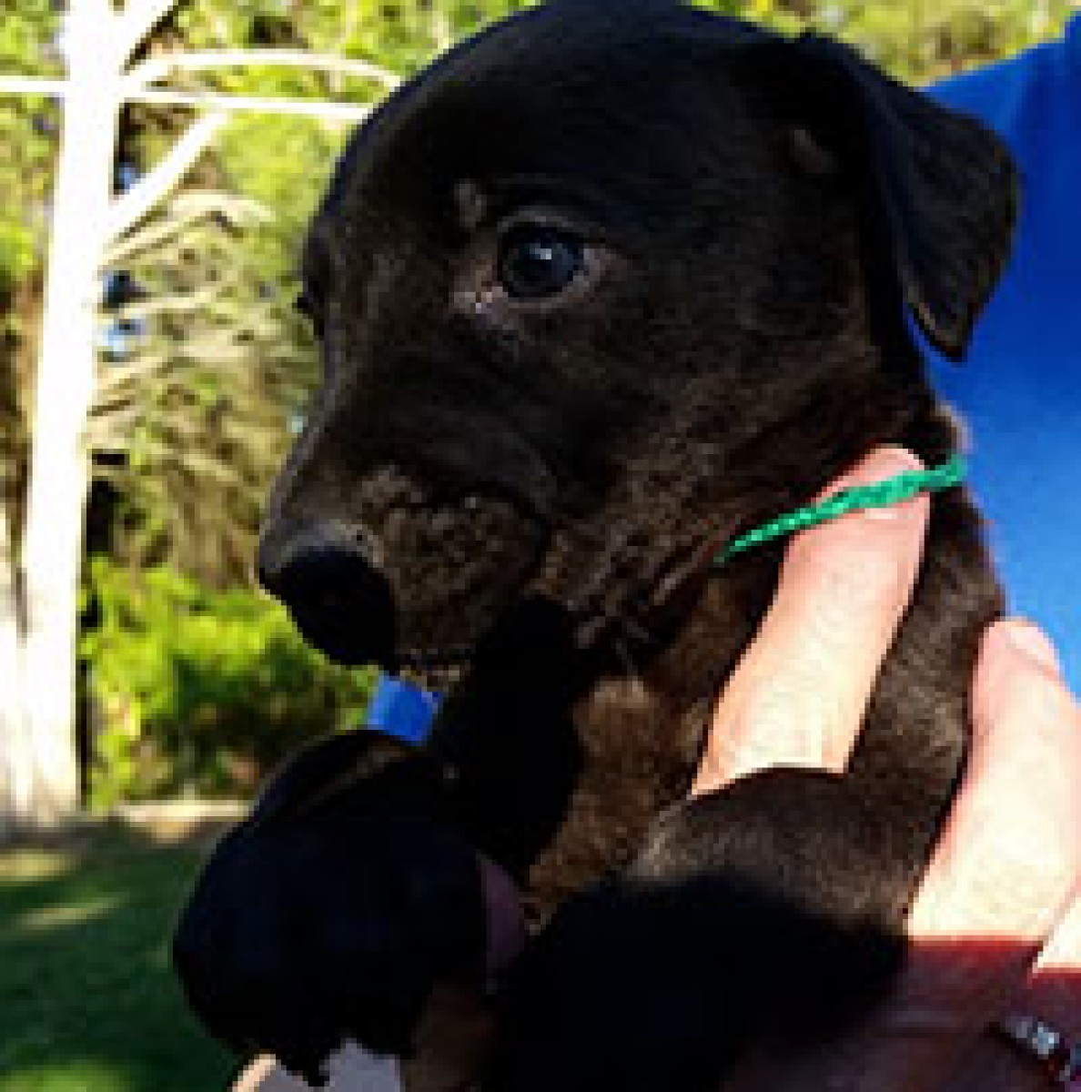 These babies were born on 8/10/2016. Belle is a black short haired female puppy. She is wearing a solid turquoise collar. She is too young to be able to describe his personality yet. Her mother is about 65 lbs bur these pups look like they will be smaller than that.
