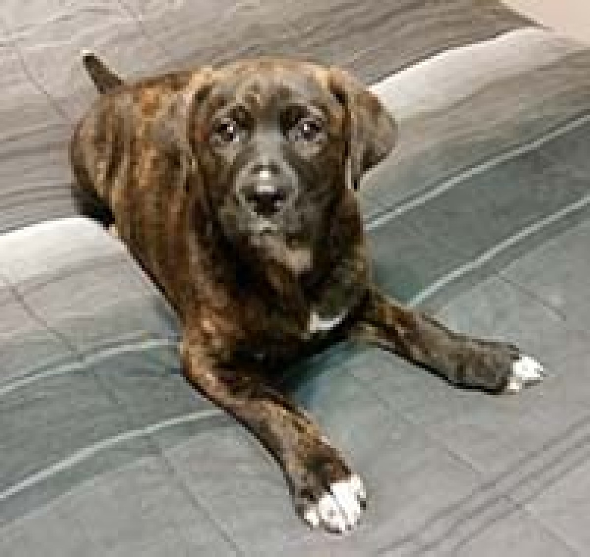 Louise is a Mastiff mix who much like her sister Thelma enjoys playtime, snuggling, and running around the yard. She is dark in color with some white on her paws.