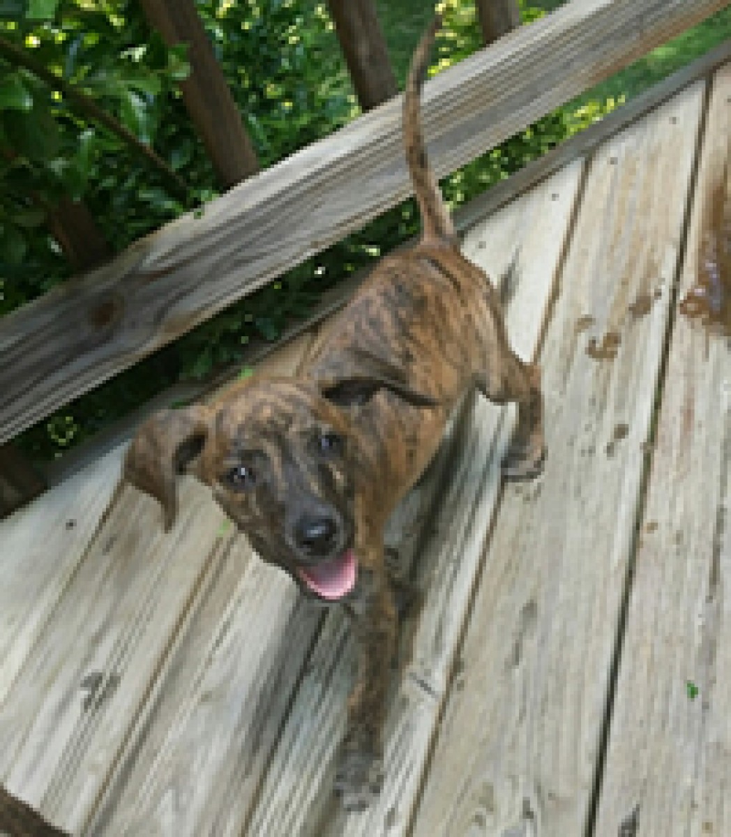 RETURN: Janis came to AFH with her siblings. Mom was a tiny Rat Terrier. Janis is going to be a looker when she grows up. When you adopt a brindle like Janis, you get a black dog, and a white dog, and a tan dog all in one! That is like, super-good value. Janis is, like her puppy mates, a good-natured puppy who is playful, happy and loves attention from people. Janis was 7 pounds at 10 weeks old and is expected to be a smaller dog when she reaches maturity.
