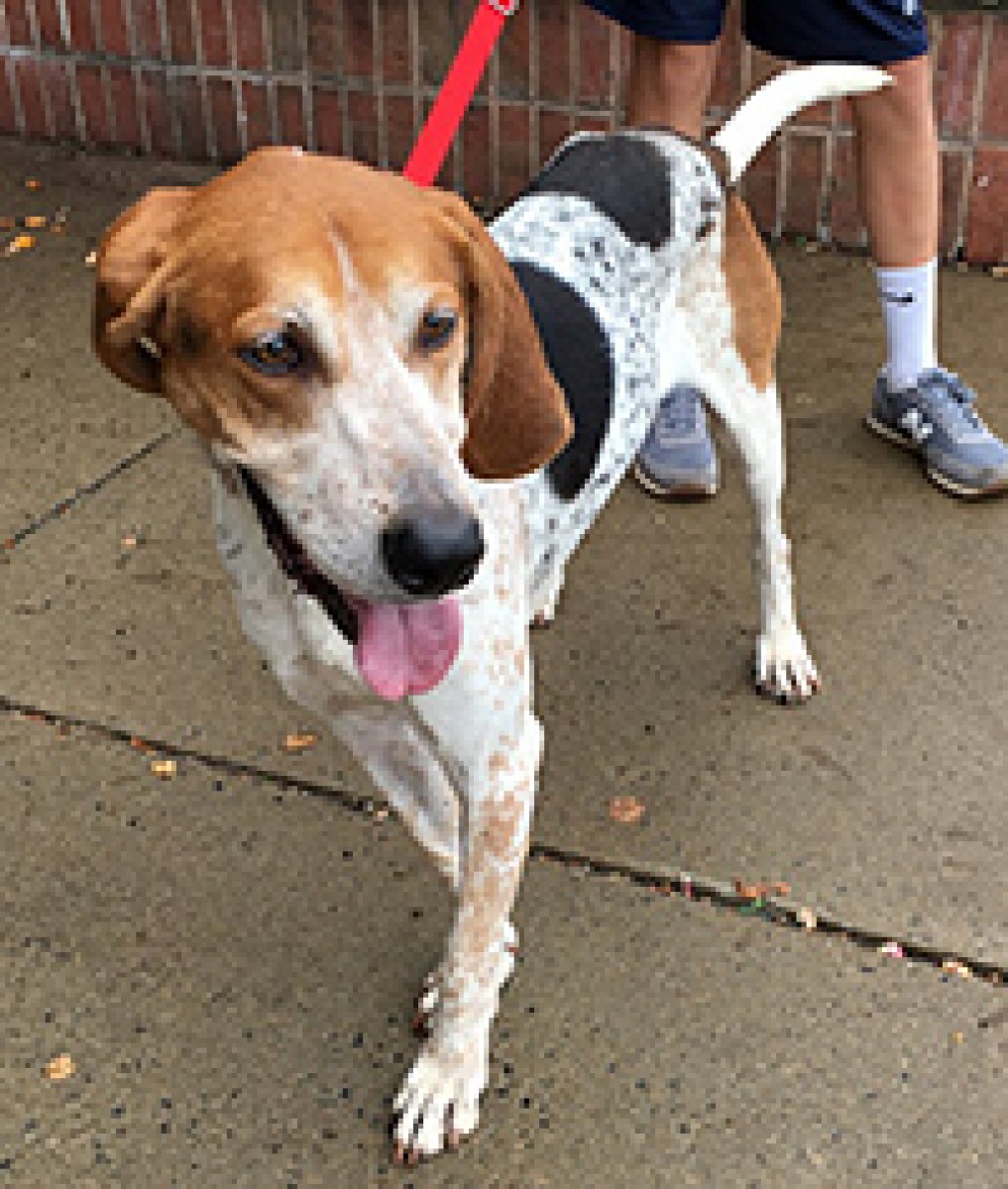 Noland is a VERY sweet, happy, playful Treeing Walker hound. He is a wonderful, loving, responsive dog who is eager to please. He is also very smart and learned to sit, shake, and spin in just a few days. But his most endearing quality is his affection and gentle kisses. He is crate-trained and house train. He is quiet when crated (he usually goes to sleep) so he won’t keep you up at night. He loves to go on long walks and needs exercise. Noland is a busy, country boy who is learning to be an urban gentleman. If he catches a scent of a wild animal, he will be distracted. He’s learning to walk on a leash and does respond to firm commands. I hope you will give this lovable, adorable fellow a forever home.