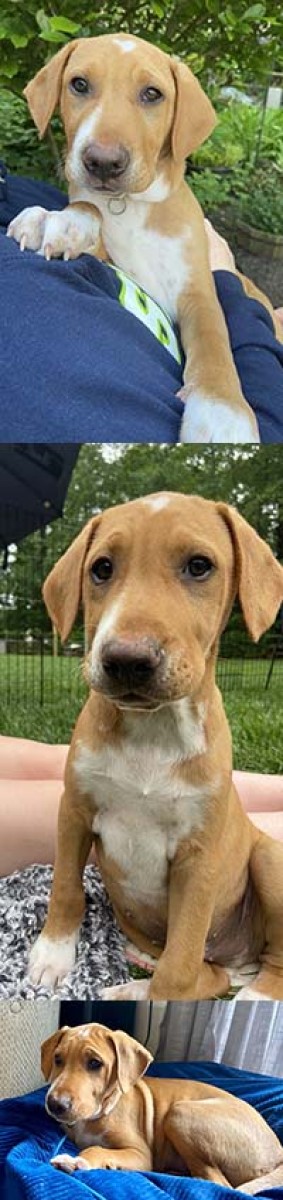 Barney is a handsome, sweet boy. He has the most adorable eyes and can make your heart melt when he looks at you. He has a gentle nature and it is so evident when he gently takes a treat from you. He is curious and loves being outside. He loves our 4-year old lab/hound mix and seems to just know when she's not interested in playing with him. He is crate trained and has been sleeping with his sisters through the night. He whines to let us know when he needs to go outside and is doing so well with house training. He is learning to sit on command. We are also working on the paw command; it’s super cute.