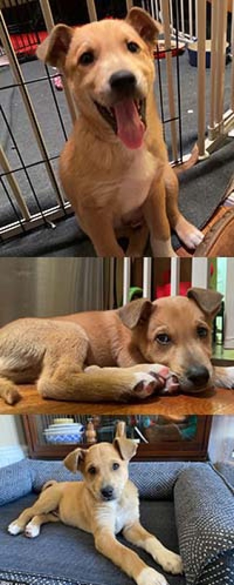 Liam is a very good boy. As sweet as his siblings, but also a little more chill and independent than them. He will go exploring, take a nap, and then come looking for snuggles. He may be the most striking of the siblings because he has a mohawk running down the middle of his back. He’s a puppy so wrestling, playing tug, and chasing his siblings, especially his brother, are his favorite pastimes. He gets along great with the neighborhood kids, ranging from 15-months to eight-years of age, adults, and other dogs. He is a bit of a smarty-pants. He has caught on quickly with training and is pretty good at “sit” and “touch.” Given his age, he is learning the best places to sleep (the dog bed or the crate) and where to pee and poop (newspaper or outside). He is too young to sleep through the night, but he is content to entertain himself and let you sleep (if he can get out of the crate to pee and poop). Liam and his siblings were found by a mail carrier along a road in Louisiana. Wouldn’t you like to make this smart and sweet pup part of your family?