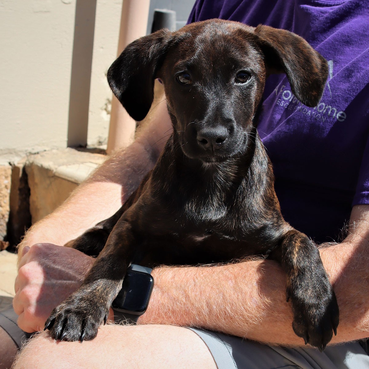 Everyone needs Waffles in their life. I am a pure bred love. I should be about 35-40 labs full grown, so I’m going to be the perfect size. I am mostly housebroken and working on waiting for my food but I love mealtime and jump 4 feet in the air. I’m voted most friendly to kids of all ages, and dogs , even if my foster dog doesn’t realize I’m his best friend yet! I have a beautiful brindle coat and tolerate quick baths and nail trims. I sleep in my crate all night but love to cuddle and will sit patiently watching TV. All my siblings have left and my Mom leaves next week so it’s my turn now!