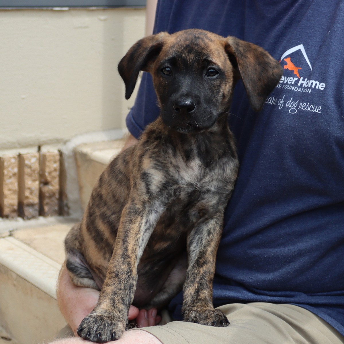Christine's pups were born in rural Louisiana to Karma, a stray. The person who found Christine will spay her and keep her. Darla has a black and brown brindle coat and more black around her muzzle. She is sweet, playful, and cuddly and has a curious, confident nature. Darla loves to play with her sisters and is learning and growing every day.