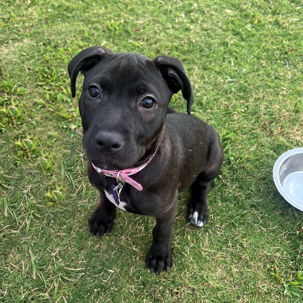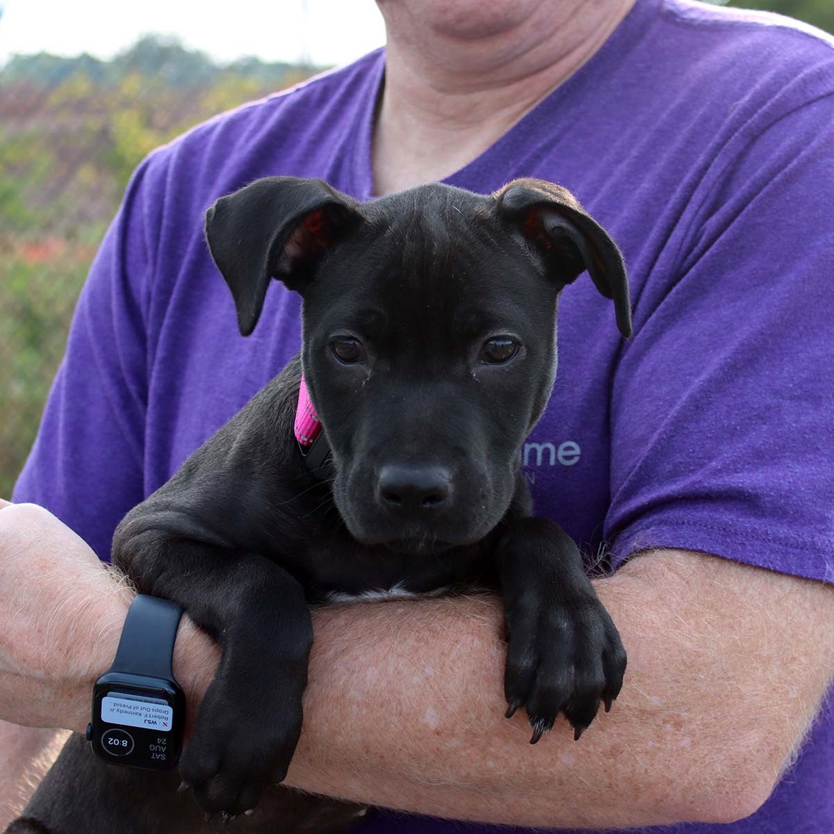 AFH rescued Joy from a shelter in a rural area when animal control picked Joy as a stray. Since coming to AFH Joy has shown that she loves to learn and she is a fast learner. She warmed right up when arriving. She will gladly run up to meet you and give lots of love. She has learned how to walk on a leash a little bit but we are still working on it and she is quickly learning the sit and come commands. We are still working on house training. She is seeming to take to crate training well as she has slept between 4-7 hours without any accidents. She is still a young puppy so we are working on her manners, but she seems to be redirected really well. Joy is a sweet dog who seems to love everyone she has met so far: adults, children ranging from 5-12, other dogs of all ages, and cats. She loves to run around in a fenced yard with other dogs or simply play with her toys in her play pen. With being a young puppy she has a lot of energy and loves to get it out whether it’s with zoomies or playing with her dog pals. After a long play session she likes to cuddle up and take a nap and then is ready for more play! Joy will fit into almost any household!