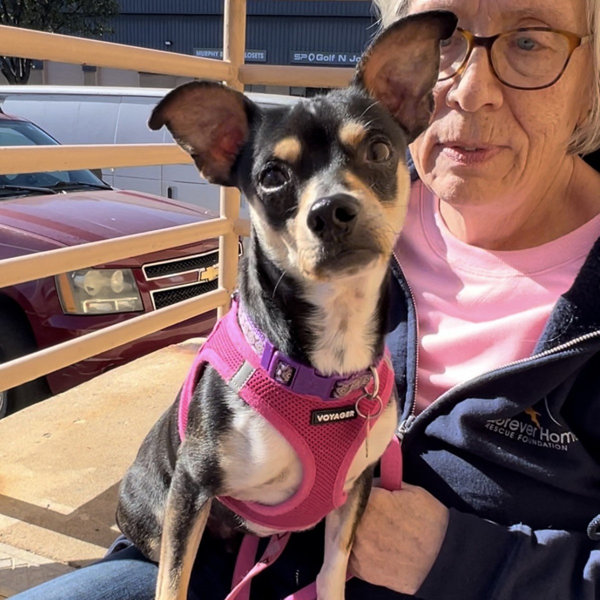 This adorable little boy is Shady. He came from a hoarding situation with 150 chihuahua mixes from one small home. You would not guess it now. He has become a new member of the world of socialized dogs. He is housetrained, crate trained, and does very well on leash. He has found his voice and loves to play with his toys. He will now allow petting and will accept treats. He still is nervous around children which is common for the breed. He would love a home with a family who will give him time to know you. When he does, he will love you forever! Do come meet him at adoption and see what a great little pup he is.