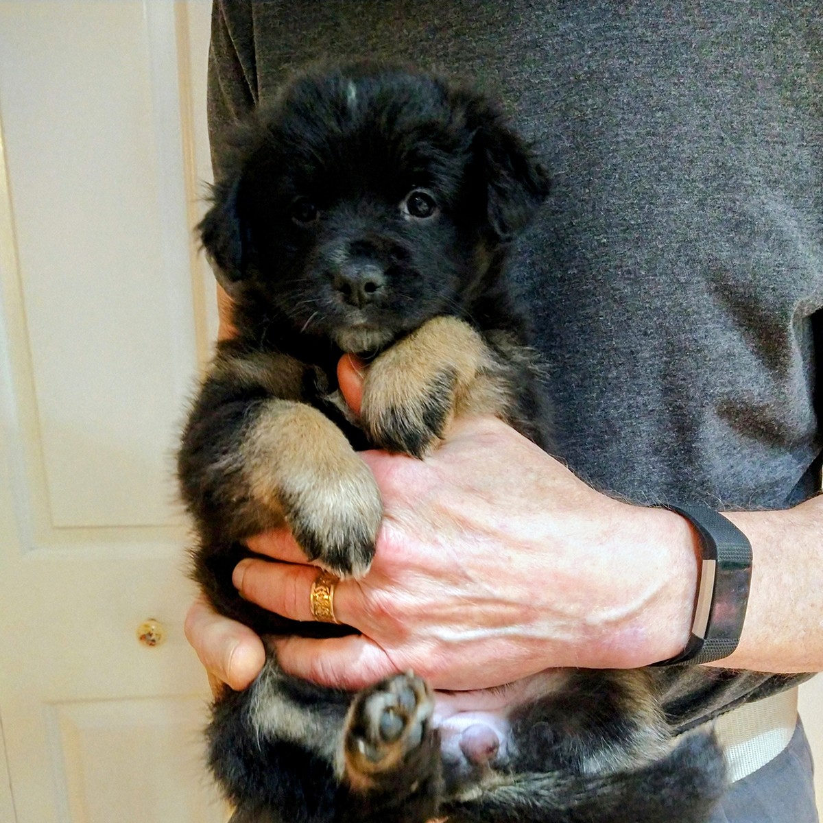 Rose is the vivacious fluff ball of this litter. Combine that with being very black with a thick fluffy coat, she loves finding the coolest place to chill out which frequently means she is resting away from the ‘puppy pile’. She is distinct in appearance with a small white stripe on the top of her forehead. Rose is a riot to watch, frequently rolling in the dog food mush as her mom cleans up the leftovers. She is a good kisser when invited and a real wiggle worm when she approaches you for affection, which is all the time. She is also curious and confident in new situations.