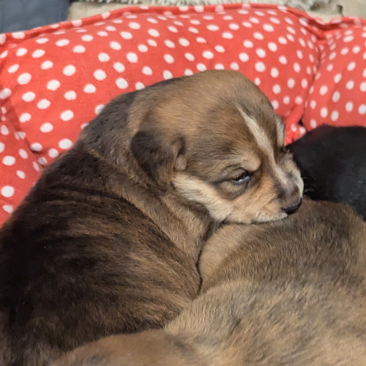 Peyton's Pups were born in AFH's care on 10/11/2025....Butter is adorable. We probably should be calling her “apple butter,” because she’s as sweet as pie. Butter is curious and loving—she maximizes her snuggle time with kisses. This smart girl doesn’t miss much!